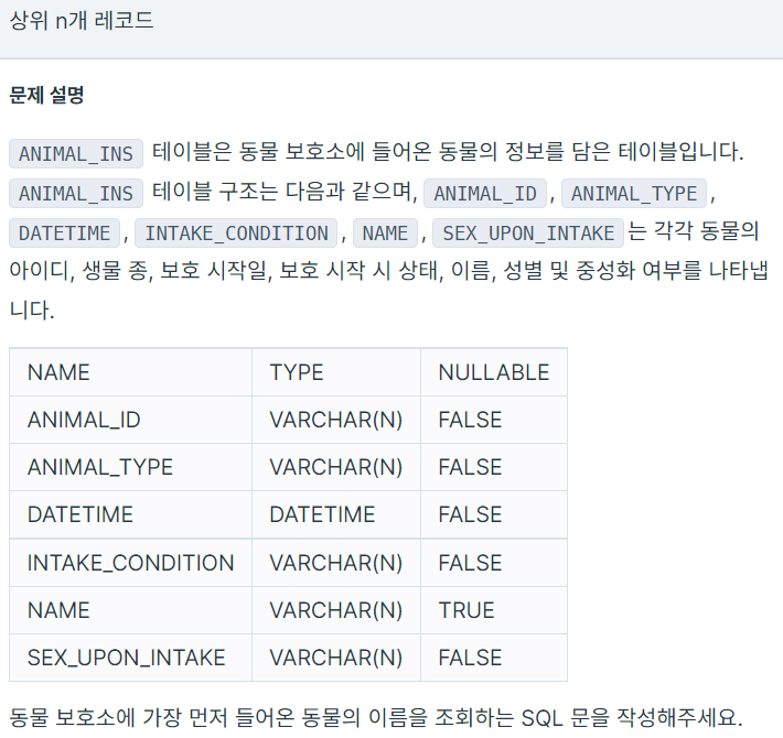 where datetime=(select min(datetime) from animal_ins);'Programmers > MySQL' 카테고리의 다른 글